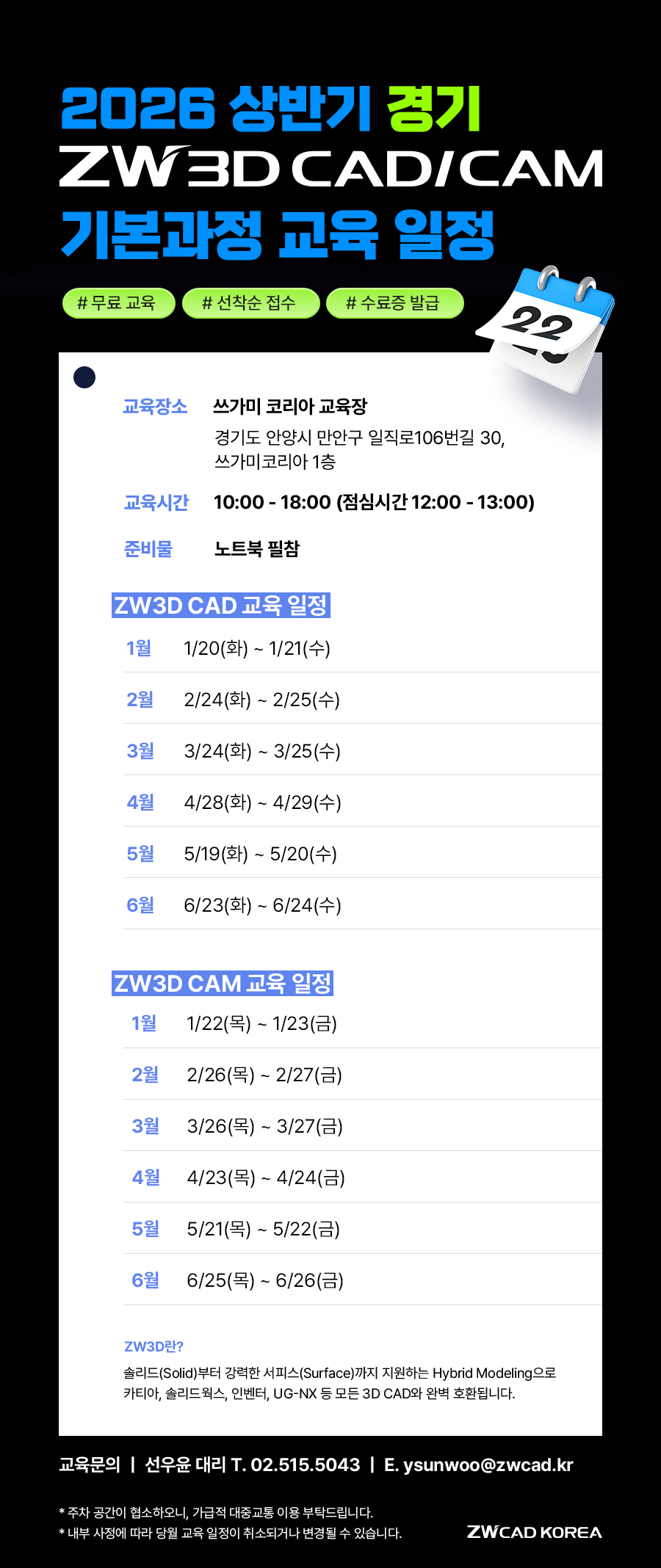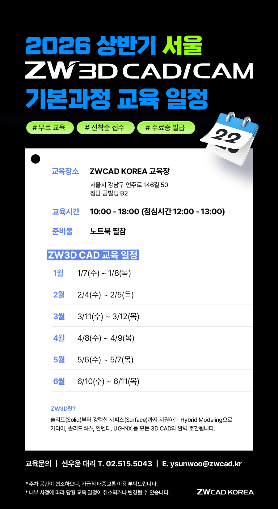 ☆[ZW3D 서울·경기] 2026년도 상반기 ZW3D CAD/CAM 기본 과정 교육 일정