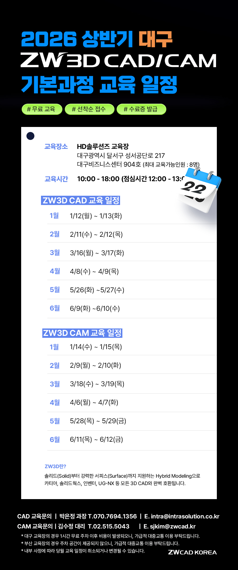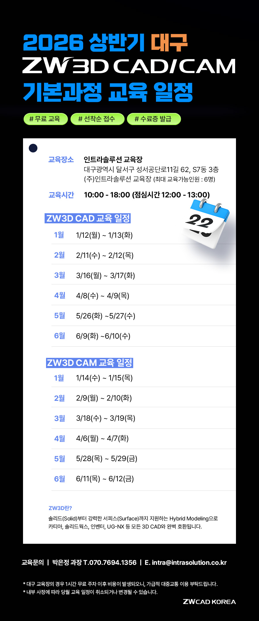 ☆[ZW3D 대구] 2026년도 상반기 ZW3D CAD/CAM 기본 과정 교육 일정